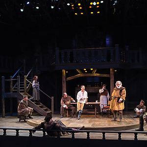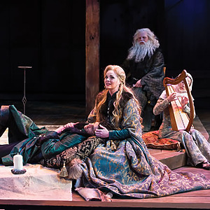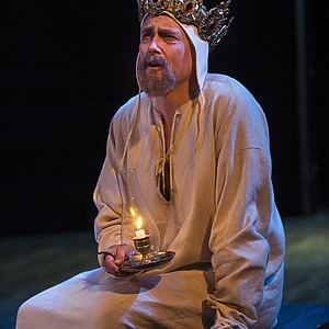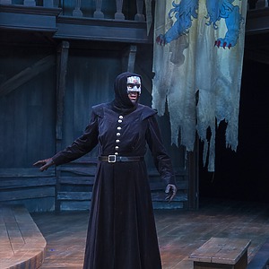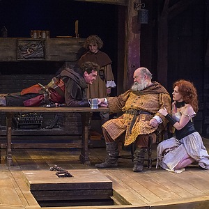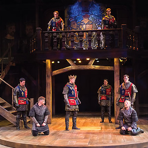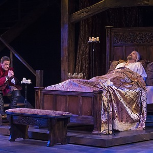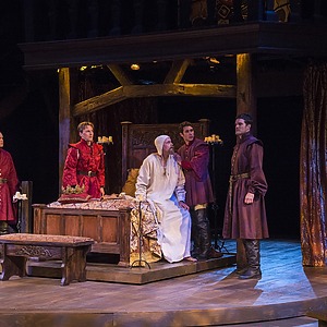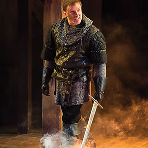 In a very masculine production focused on father/son relationships and the internal struggle of duty, the score consisted of traditional Welsh lullabies, battle drums, angry brass, and variations of period drinking/rugby songs. The play began with a voiceover of Richard II (David Ivers) from within the mind of King Henry as he contemplates the state of his kingdom and reign. Throughout the last 15 minutes of the play, during all the battles and battle scenes, powerful drums underscored/overscored the action and drove the play towards its end until Hal and Hotspur’s final sword fight when the haunting Welsh lullaby, Suo Gan, overtook the space. An exciting part of this production process is that USF is producing the history cycle in historical order, with recurring characters remaining the same cast member. So, the actor playing Hal in Henry IV Part 1 returns in Part 2, and grows up to be Henry V. An intriguing way to extend the audience’s interest in a story, and a gamble that I believe will pay off, since the cast was fabulous.